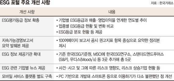 20일 거래소는 지난해 12월 개시한 금융권 첫 공공 ESG 정보플랫폼 'ESG 포털'의 제공 서비스 및 콘텐츠를 확대했다고 밝혔다. 최근 서비스를 재개했다.