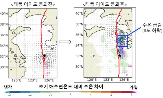 이 연구에서 태풍에 의해 바닷물의 수직 혼합이 강력하게 이뤄져 순간적으로 바닷물 온도를 최대 6도까지 떨어뜨려 전선(성질이 다른 두 기단의 경계면이 지표면과 만나는 선)을 형성하는 것으로 분석됐다.