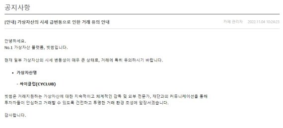 앞서 이날 빗썸은 전날 오후 3시 싸이클럽에 대한 거래 지원을 종료했다.