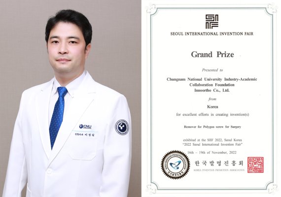 23일 세종충남대학교병원에 따르면 정형외과 이정길 교수가 최근 서울 코엑스에서 개최된 ‘서울국제발명전시회’에서 ‘외과용 다각 잠김 나사 제거 장치’를 출품, 대상을 수상했다.
