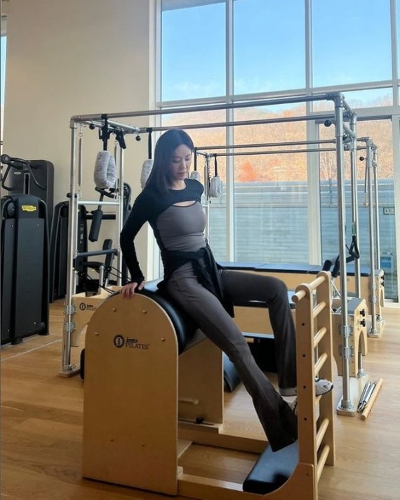 필라테스 기구 위에 올라 포즈를 취한 모습이다. 부츠컷 디자인의 의상으로 늘씬한 몸매를 자랑해 눈길을 끈다.