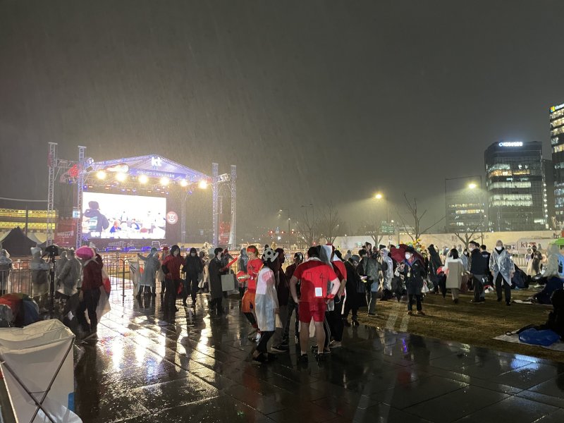 [파이낸셜뉴스] 28일 한국과 가나의 2022 카타르 월드컵 조별리그 H조 2차전을 앞두고 빗속 거리응원에 대비해 광화문광장에 임시 대피소가 설치됐다.