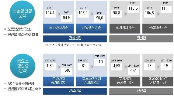 건설산업에서는 과거와 같은 노동과 자본 투입을 통한 성장을 기대하기 어렵고, 경기부양을 위한 건설투자 확대도 어려운 상황이다. 건설경기 하락 전망, 고령화, 민간부문의 저조한 기술투자, 규제 중심의 제도 여건 등의 영향으로 건설산업에서는 앞으로 생산성 저하가 지속될 것으로 예상된다.