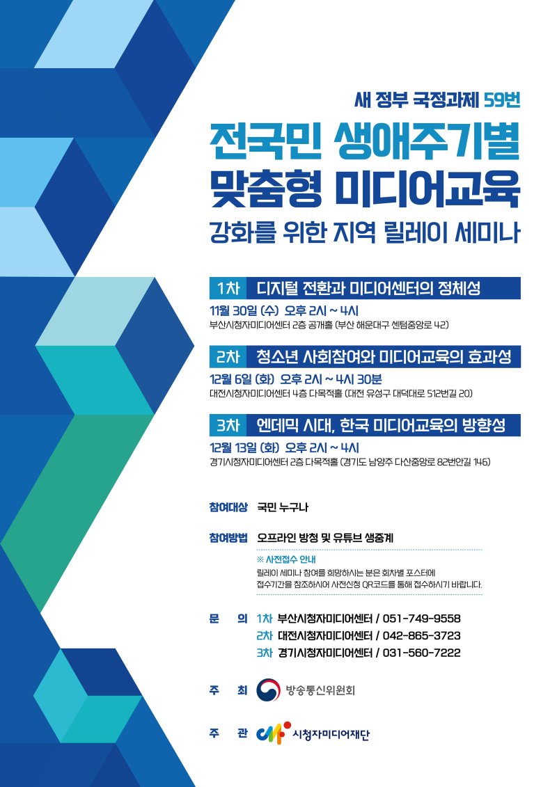 이번 세미나는 그간의 미디어 교육 성과를 점검하고 새로운 방향성을 모색하고자 마련됐다. 오는 30일 부산을 시작으로 12월6일 대전, 12월13일 경기 등 총 3회에 걸쳐 진행된다.