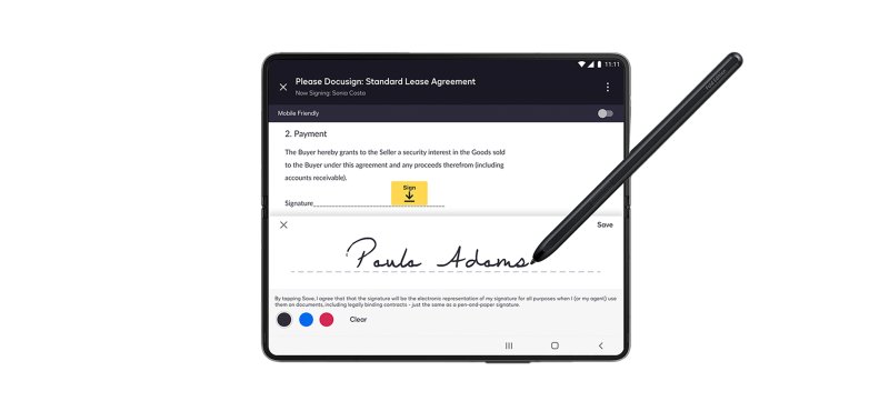 포춘 500대 금융사 25곳 중 24곳이 사용하는 도큐사인도 지원된다. 사용자는 멀티뷰 모드에서 이메일 첨부파일을 도큐사인의 전자서명으로 신속하게 드래그 앤 드롭할 수 있으며, S펜과 전용 플렉스 모드를 사용해 보다 빠르게 서명하고 거래할 수 있다.