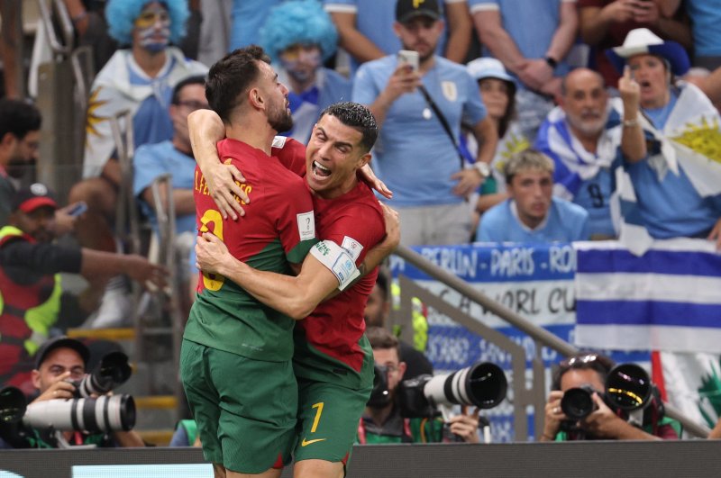 호날두는 29일 카타르 도하 루시알 스타디움에서 열린 우루과이와 '2022 국제축구연맹(FIFA) 카타르 월드컵' H조 조별리그 2차전에서 브루노 페르난데스의 슈팅에 머리를 갖다 댔다.