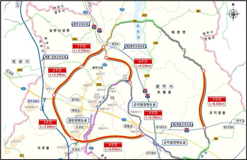 1~7구간으로 나눠 건설되는 광주시 순환도로는 총 연장 29.3km로 중부고속도로 광주IC~목현동~오포~초월~광주IC를 연결한다. 경안천변도로는 오포읍 일대 8km구간에 건설되고 곤지암천변 도로는 곤지암천을 따라 곤지암읍에서 초월읍까지 7.68km를 연결한다. 이들 도로 건설에 필요한 예상 사업비는 1조57억원이 소요될 것으로 추산된다.