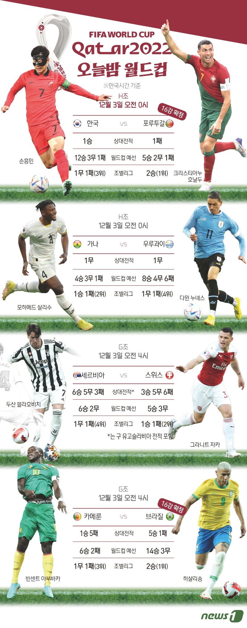 1무1패(승점 1)를 기록 중인 한국은 포르투갈(2승·승점 6)을 상대로 대회 첫 승과 함께 기적 같은 16강 진출에 도전한다. 한국이 포르투갈을 꺾는다고 해도 가나(1승1패·승점 3)-우루과이(1무1패·승점 1)전 결과를 지켜봐야한다.