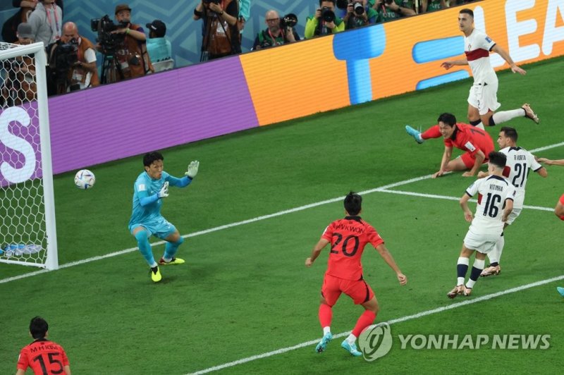 실점하는 한국 실점하는 한국 (알라이얀=연합뉴스) 김주성 기자 = 3일 오전(한국시간) 카타르 알라이얀의 에듀케이션 시티 스타디움에서 열린 2022 카타르 월드컵 조별리그 H조 3차전 대한민국과 포르투갈 경기. 전반 5분 포르투칼 히카르두 오르타가 득점을 하고 있다. 2022.12.3 utzza@yna.co.kr (끝) (끝)