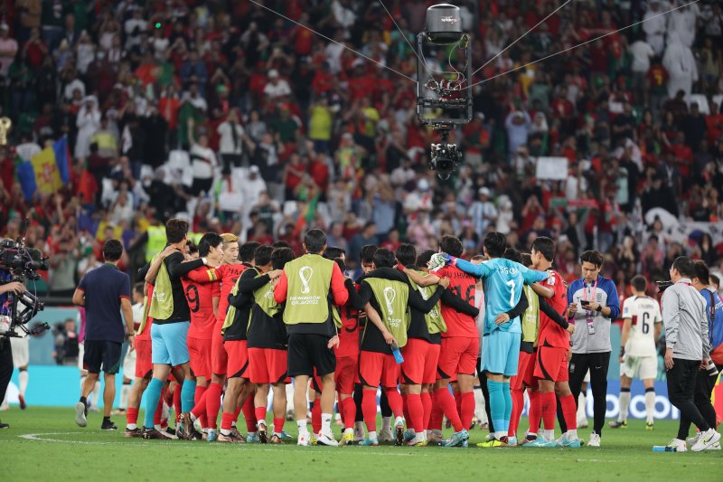 (서울=뉴스1) 김민수 기자 = 한국이 3일(현지시간) 2022 FIFA 카타르 월드컵 H조 조별리그 최종 3차전에서 2-1로 포르투갈을 꺾고 16강에 진출한 가운데, 로이터 통신은 한국의 16강 진출에 있어서 가장 힘겨웠던 순간은 우루과이와 가나의 경기 결과를 기다리던 약 10분의 순간이었다고 보도했다.