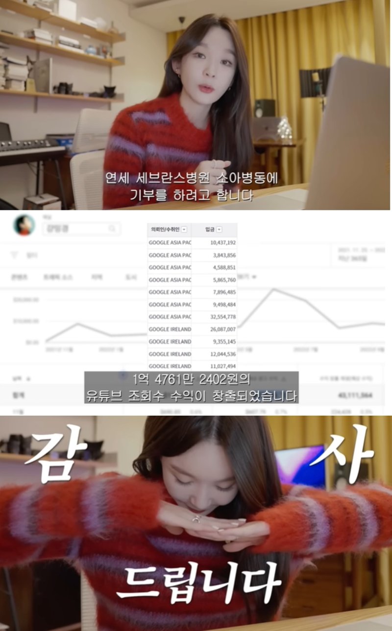 강민경은 "영상의 퀄리티를 올리려고 많이 노력했는데, 그걸 알아봐 주시더라. 정말 조회수도 많이 나왔다. 보람찼다. 지금 유튜브 통장을 따로 쓰고 있는데 확인해보니 1억 4761만원 정도의 조회수 수익이 창출됐다. 이건 팬 여러분들께서 봐주셔서 얻을 수 있었던 돈이다. 그래서 뭔가 좋은 곳에 쓰고 싶어서 연세 세브란스 소아병동에 기부하기로 했다"고 밝혔다.