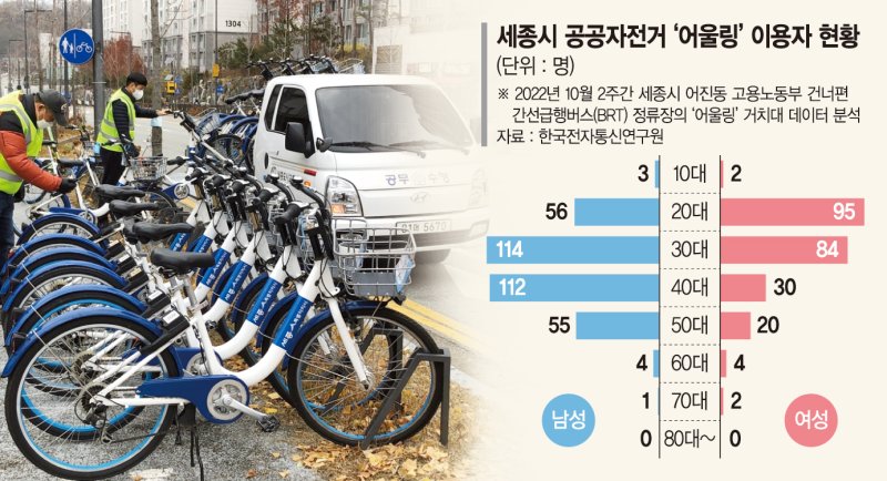 연구진이 개발한 디지털 트윈 플랫폼을 활용, 지난 10월 2주간 세종시 어진동 고용노동부 건너편 간선급행버스(BRT) 정류장의 '어울링' 거치대 데이터를 분석했다. 그결과, 이용자는 20~40대가 주를 이뤘으며, 이용시간은 20분 이내로 2㎞ 정도 사용했다. 시간대별로는 오후 6시경에 집중적으로 어울링을 대여했으며, 반납은 오전 8시경에 몰렸다.