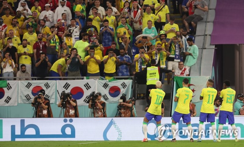 환호하는 브라질 대표팀 환호하는 브라질 대표팀 (도하=연합뉴스) 김주성 기자 = 6일(한국시간) 카타르 도하 974스타디움에서 열린 2022 카타르 월드컵 16강전 대한민국과 브라질의 경기. 부상에서 복귀한 네이마르가 페널티킥을 성공한 뒤동료 선수들과 환호하고 있다. 2022.12.6 utzza@yna.co.kr (끝) (끝)