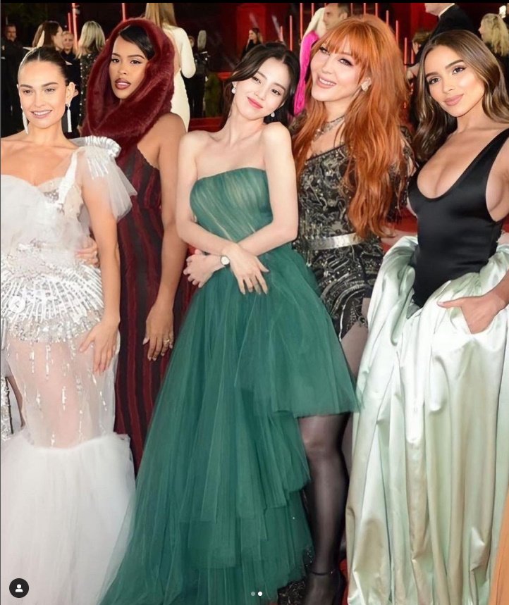 사진 속 한소희는 해외 한 행사장에서 드레스를 차려입은 외국 미녀들 사이에 서 있다. 초록색 드레스를 입고 포즈를 취한 가운데, 하얀 피부와 함께 드러낸 아름다운 자태가 눈길을 끈다.