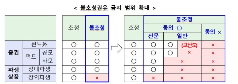 소비자의 구체적·적극적인 요청이 없는 불초청권유의 경우 방문 전 소비자의 동의를 확보한 경우에만 예외적으로 허용하되, 이 경우에도 일반금융소비자들에 고위험 상품 등을 권유할 수 없도록 했다. 이에 따라 현행 장외파생 금지 뿐 아니라 고난도상품, 사모펀드, 장내·장외파생상품 권유가 금지된다. 단, 전문금융소비자의 경우 현행과 동일하게 장외파생상품에 대해서만 금지된다.
