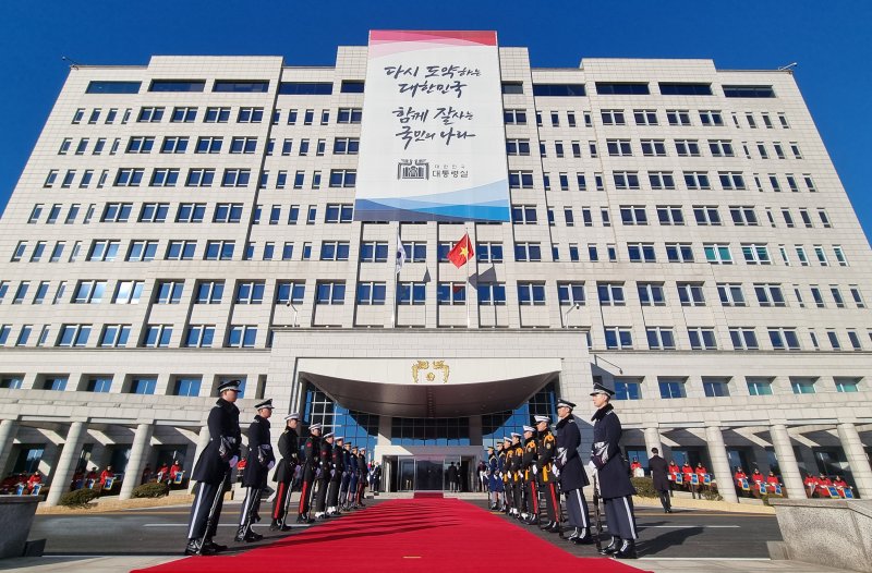 [서울=뉴시스] 전식 기자 = 5일 오후 서울 용산 대통령실 청사 앞에서 한국을 국빈 방문한 응우옌 쑤언 푹 베트남 국가주석 공식환영식을 위해 의장대가 대기하고 있다. (대통령실통신사진기자단) 2022.12.05. photo1006@newsis.com /사진=뉴시스