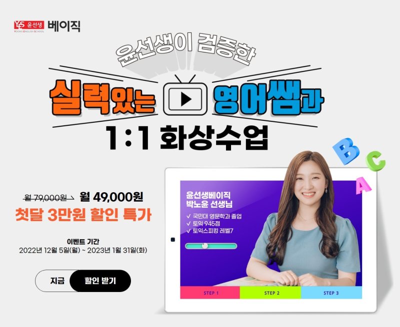 윤선생은 화상영어와 방문학습 브랜드를 중심으로 겨울방학 시즌 공략에 나선다. 일대일 화상영어 브랜드 윤선생베이직은 내달 31일까지 신규 회원을 대상으로 첫 달 영어 학습비 3만원 할인 프로모션을 진행중이다.