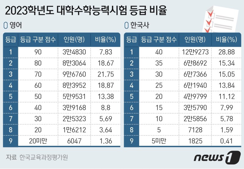 [표] 2023학년도 수능 등급별 비율-영어·한국사