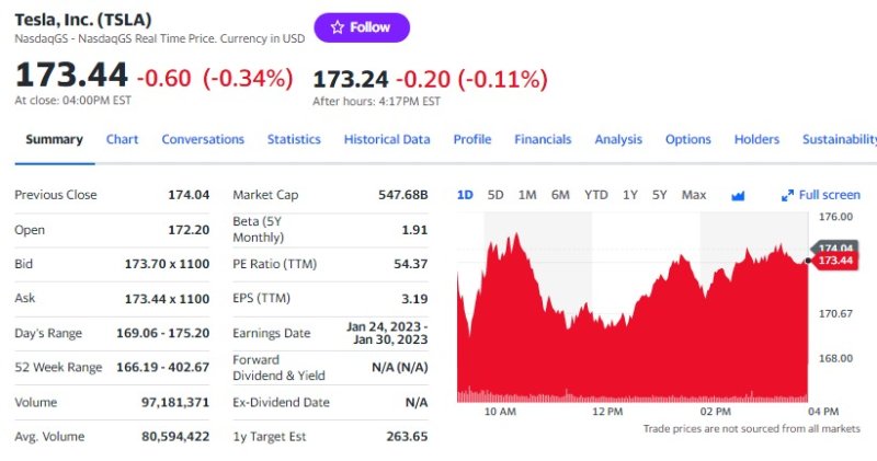 이날 테슬라는 뉴욕증시에서 전거래일보다 0.34% 하락한 173.44달러를 기록했다.
