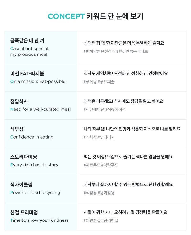 2023외식업트렌드의 7대 키워드를 관통하는 주제어는 'C.O.N.C.E.P.T'이다.