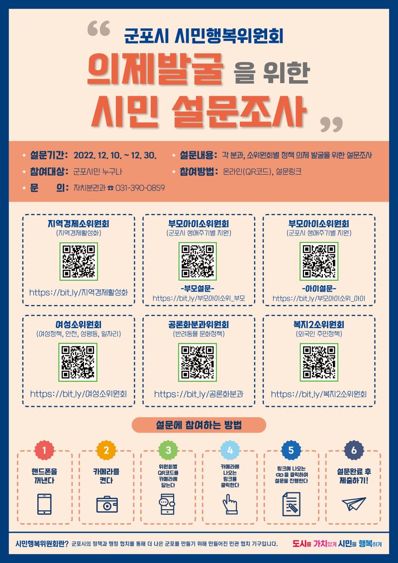 [군포=뉴시스] 박석희 기자 = 경기 군포시는 협치 활성화를 목적으로 하는 시민 행복위원회가 2023년 정책의제를 발굴하기 위해 오는 30일까지 설문조사를 한다고 14일 밝혔다.