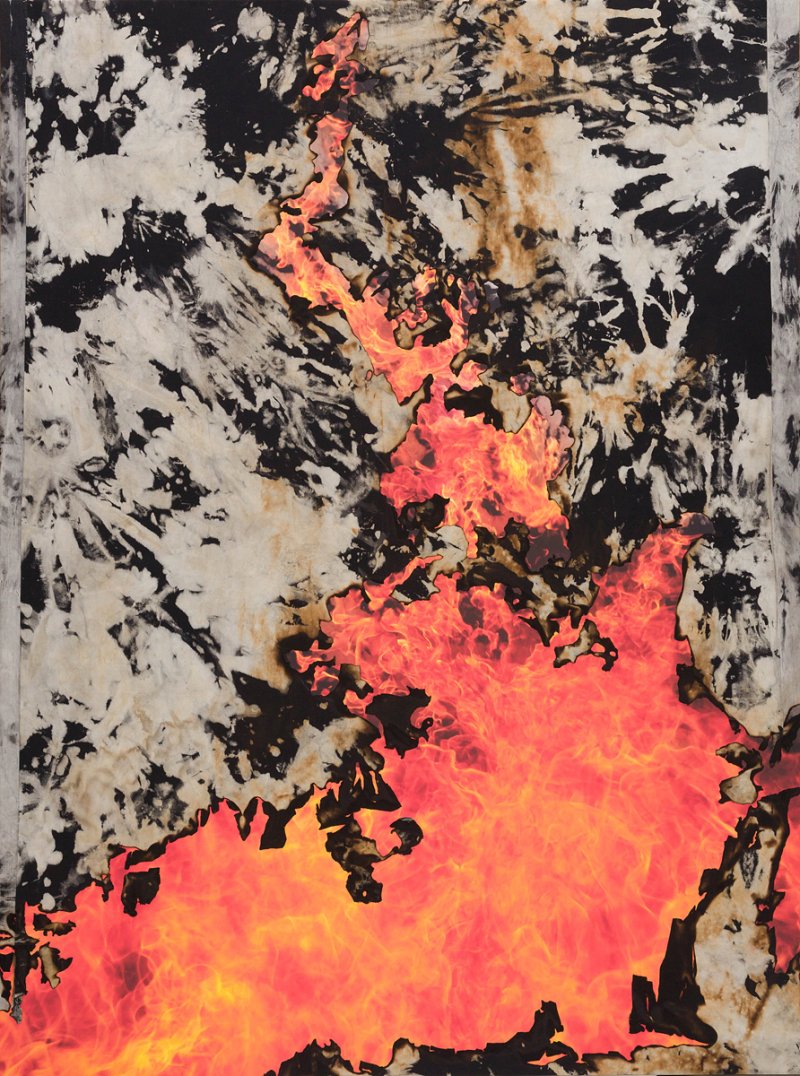 자신의 신체를 각인하거나 땅의 텍스처를 고스란히 옮긴 이 이미지들은 이후 불이 활약할 수 있는 무대, 불이 연소할 수 있는 재료가 된다. 회화에 불을 붙인 후 작가는 문제의 타는 모습을 사진으로 남긴다. 불을 끈 후에는 불타고 남은 회화의 파편, 그 화재의 결과인 재, 그리고 불타는 과정을 기록한 사진이 한데 결합한다.