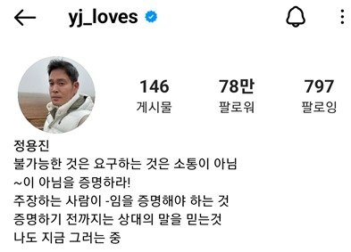 정 부회장은 15일 인스타그램 프로필에서 "불가능한 것은 요구하는 것은 소통이 아니다"며 "'~이 아님을 증명하라'고 주장하는 사람이 '~임을 증명해야 하는 것"이라고 주장했다.