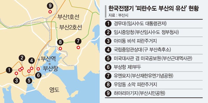 피란수도 부산유산은 시 일원에 분포하며 건축물형 유산 5곳과 장소형 유산 4곳 등 총 9곳 개별유산을 말한다. 서구의 경무대와 임시중앙청, 아미동 비석 피란주거지, 중구의 국립중앙관상대와 미국대사관 겸 미국공보원, 부산항 제1부두, 남구의 유엔묘지와 우암동 소막 피란주거지, 부산진구의 하야리아기지 등이다.