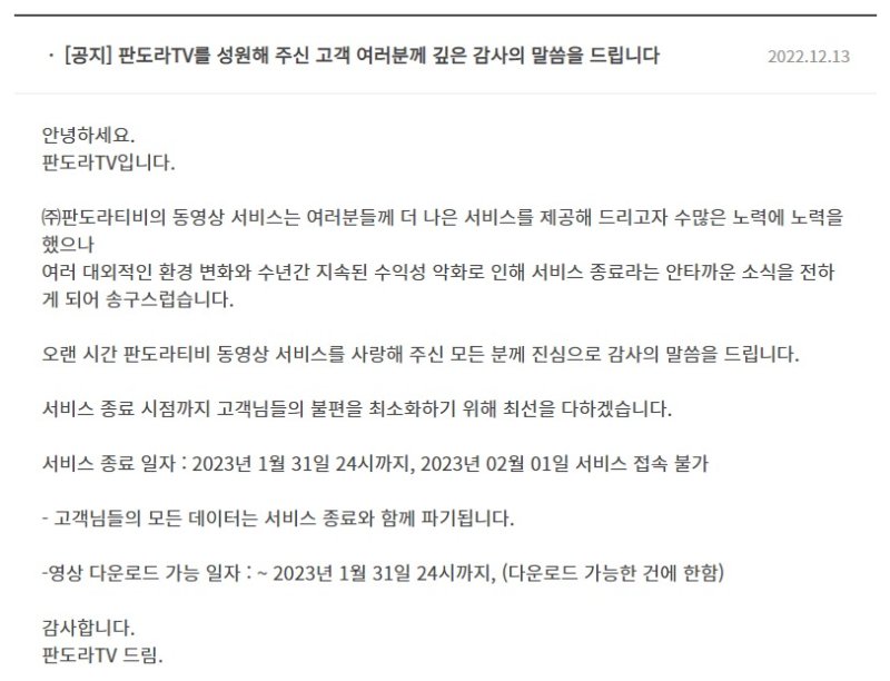 판도라TV가 밝힌 서비스 종료일은 2023년 1월31일이다. 서비스 종료와 함께 이용자 데이터는 파기된다. 업로드된 영상은 서비스 종료 전까지 다운받을 수 있다.