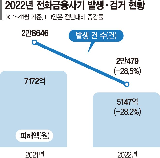 21일 경찰청 국가수사본부에 따르면 올 11월까지 전화금융사기 범죄 발생건수는 2만479건, 피해액은 5147억원으로 같은 기간 대비 발생 건수 28.5%(2만8646건), 피해 액수 28.2%(7172억원) 각각 감소했다.
