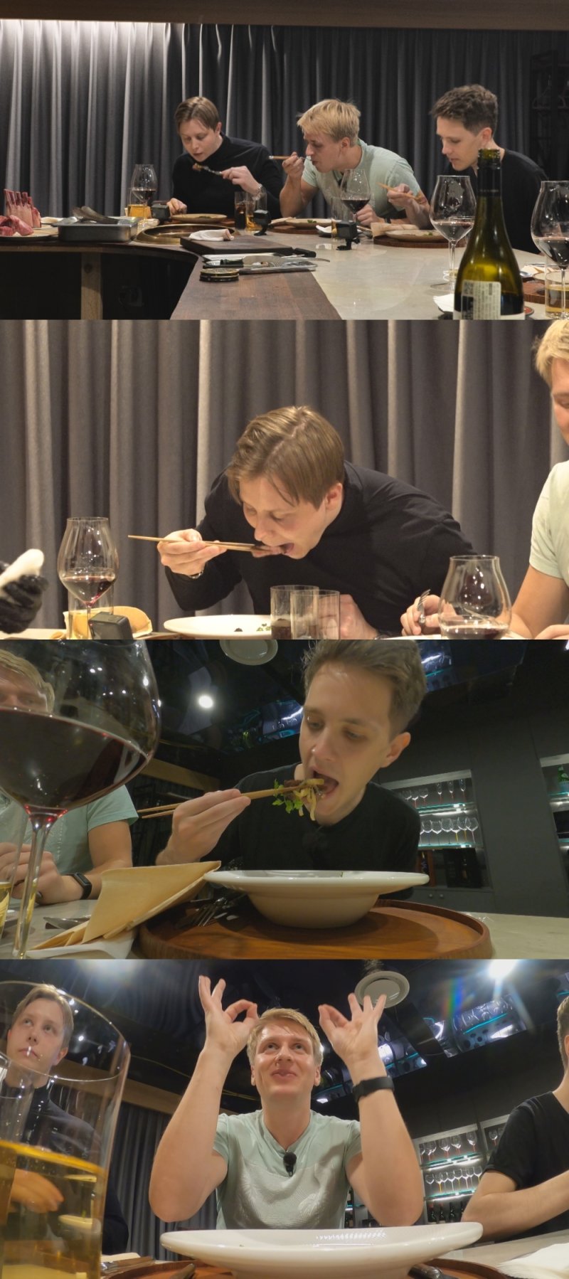 이후 스웨덴 삼인방은 양념 볶음, 튀김 등 다양한 방법으로 조리되어 나오는 퓨전 코스 요리를 빠짐없이 즐긴다. 먼저 알렉산더는 한우와 소스, 반찬의 신선한 맛 조화에 흠뻑 취한다. 또 그동안 음식을 입에 넣으면 3초 안에 삼켜버리고는 했던 푸드 파이터 조엘도 이번만큼은 맛 하나하나를 음미하며 천천히 음식을 즐긴다. 이러한 친구들의 코스 요리 먹방은 스튜디오에서 지켜보던 MC들의 식욕까지 자극했다는 전언이다.