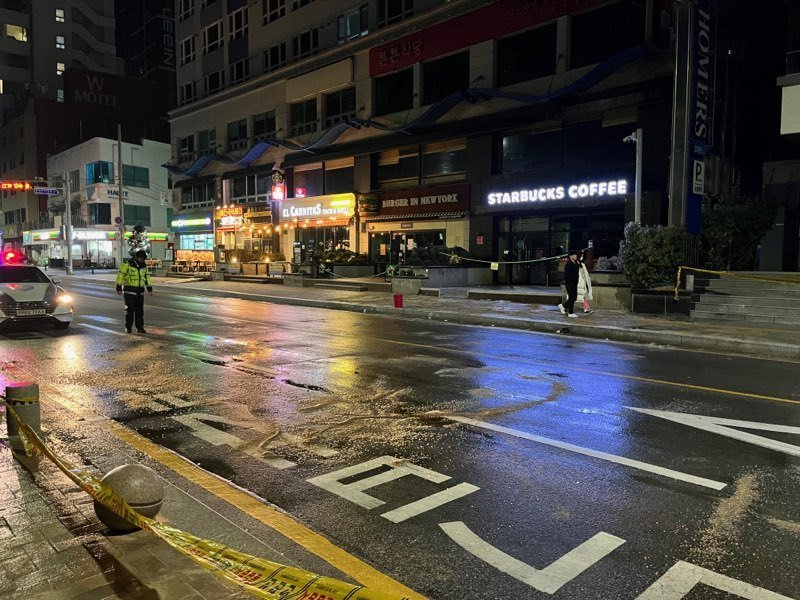 (부산=뉴스1) 노경민 기자 = 23일 오전 3시께 부산 수영구 한 오피스텔의 스프링클러 배관이 동파돼 광안리해수욕장 앞 도로로 물이 흘러 추운 날씨에 도로가 결빙됐다.