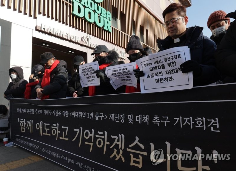 (서울=연합뉴스) 박규리 기자 = 이태원참사 유가족과 지역 상인들이 23일 이태원역 1번 출구 일대를 공식 추모공간으로 만들어달라고 요구했다.