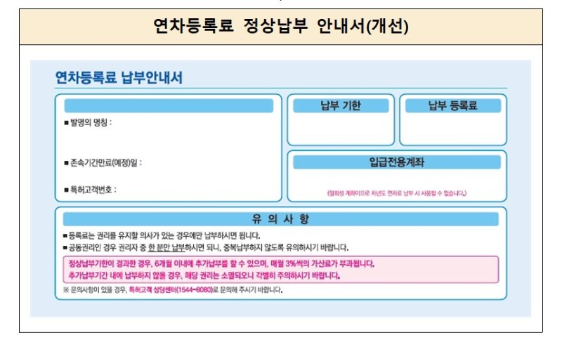 특허청은 권리를 계속 유지하고 싶은 권리자는 연차등록료를 반드시 납부해야 하지만 이를 숙지하지 못해 권리가 소멸되는 경우가 자주 발생, 납부기한 준수 및 권리소멸 주의 문구를 붉은색 상자로 강조해 부주의로 인한 권리소멸 예방에 초점을 맞췄다고 설명했다.