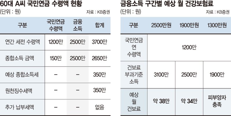 왕 전문위원은 "A씨는 연금소득과세비율이 약 50% 수준이기 때문에 절반 가까운 금액은 비과세"라며 "나머지 50만원 연금소득은 연 환산 시 600만원인데 이마저도 연금소득공제가 적용돼 실제 과세액은 150만원 수준"이라고 설명했다. 여기에 금융소득(2500만원)을 합산하면 종합소득은 2650만원이 된다.
