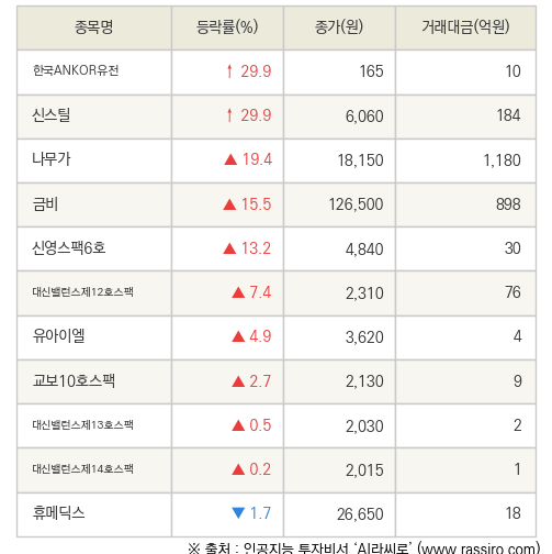 특히 한국ANKOR유전은 전 거래일 대비 29.9% 오른 165원에 거래를 마감하여 높은 관심을 받았다. 이외에 휴메딕스는 27,900원까지 올라 신고가를 경신했으나, 전일보다 오히려 하락한 26,650원에 거래를 마감했다.