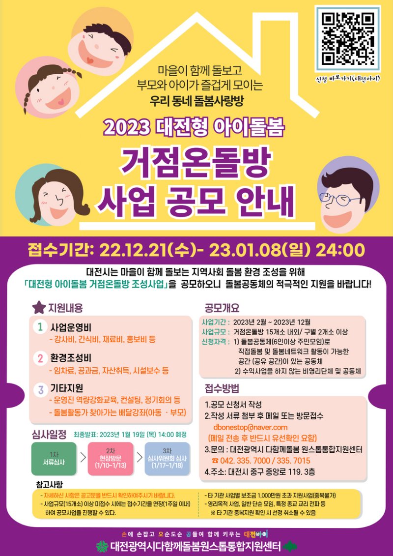 대전대학교는 산학협력단이 수탁운영하는 대전시 다함께돌봄원스톱통합지원센터가 내달 8일까지 ‘2023년 대전형 아이돌봄 거점온돌방 조성사업 공모’를 진행한다고 26일 밝혔다.