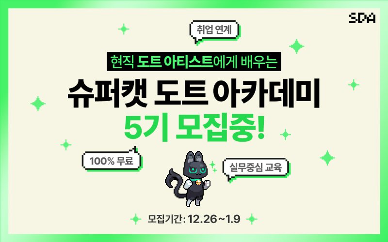 한편, 슈퍼캣은 SDA 5기 모집 시점에 맞춰 도트로 제작한 신규 캐릭터 ‘도깽이’를 공개했다. '도깽이'는 SDA 강사진의 모습을 형상화한 검은 고양이 캐릭터다.