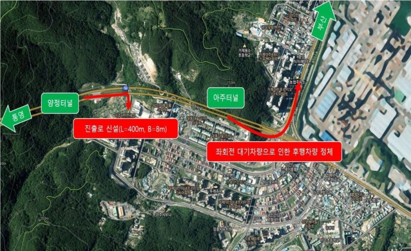 아주~상동구간은 아주터널 통과 이후 아주동 방향 진출 차량으로 잦은 정체를 빚었다.