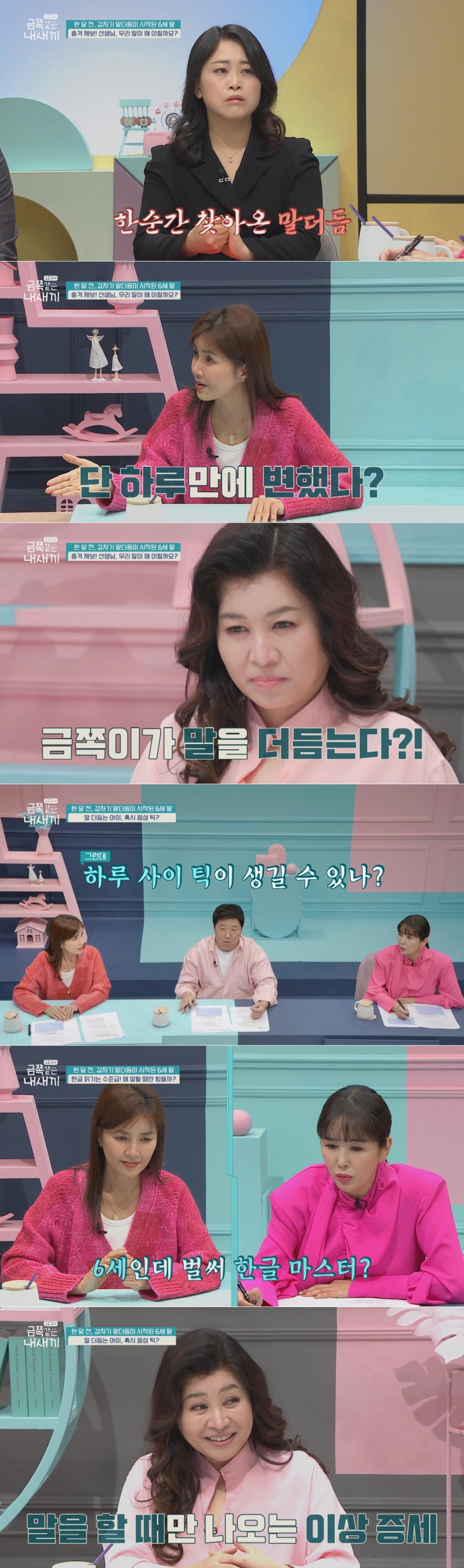 엄마는 "영유아 검진에서도 또래보다 발달이 빠른 편이었고, 한 달 전까지만 해도 말을 잘하다가 갑자기 말더듬이 시작됐다"고 고민을 전한다. 정형돈은 "음성 틱이 아니냐"고 조심스럽게 추측하고, 오은영은 "틱도 갑자기 생길 수 있고, 숨을 몰아쉬는 종류도 있다"며 더 지켜봐야 할 것 같다고 말한다.