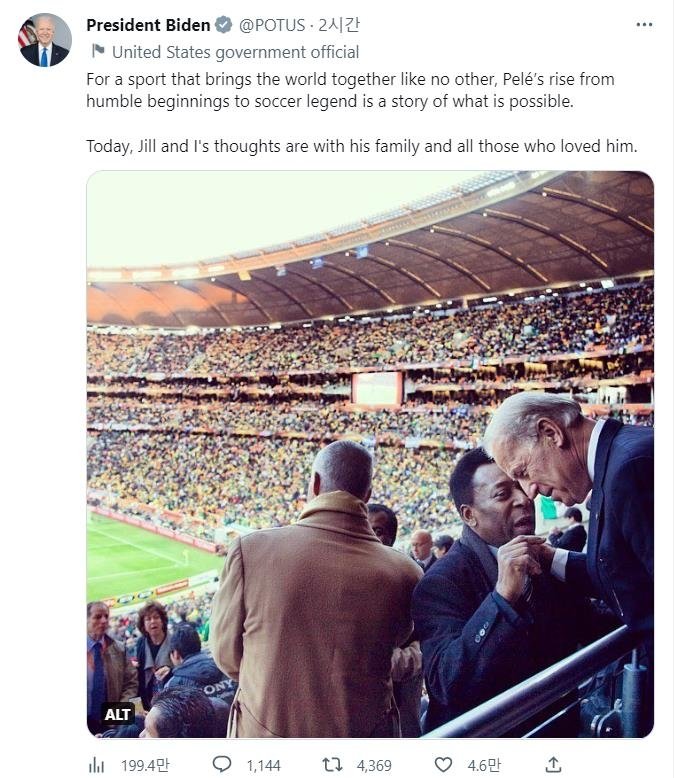 조 바이든 미국 대통령은 트위터에서 "축구는 세계를 하나로 모으는 독보적 스포츠다. 초라한 곳에서 출발한 펠레가 축구 전설의 자리에 오른 것은 (노력하면) 어떤 일이 가능한지 보여 준다"는 말로 고인을 기렸다.