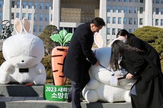 2023년 새해맞이 토끼 캐릭터 설치 행사가 2일 서울 여의도 국회 중앙잔디광장 분수대 앞에서 열려 이광재 국회사무총장이 마시마로 인형에게 출입증을 걸어주고 있다. 사진=서동일 기자