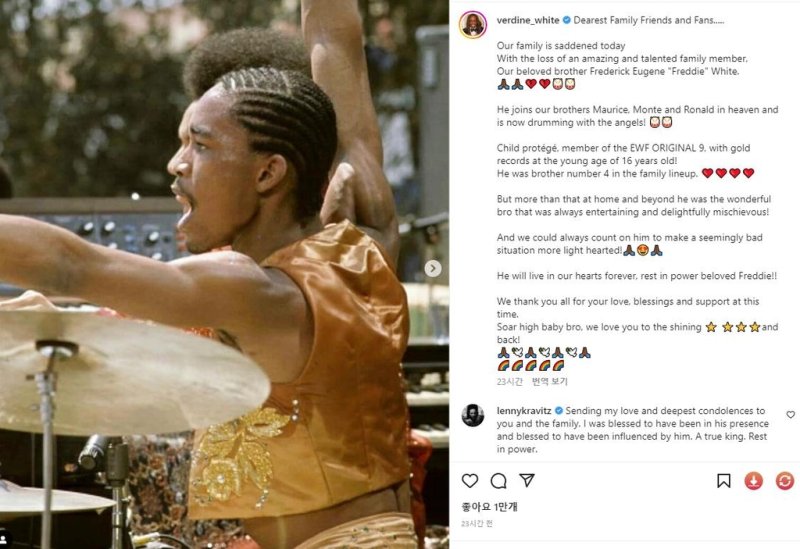 같은 밴드 베이시스트이자 친형인 버딘 화이트는 전날 인스타그램을 통해 "우리 가족은 훌륭하고 재능있는, 사랑하는 동생 '프레디'를 잃어 슬픔에 빠졌다"며 그의 부고를 알렸다.