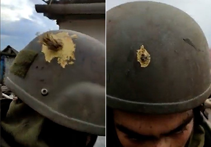 해당 병사의 동료가 촬영한 영상을 보면 헬멧의 이마에 해당하는 부분과 뒤통수 쪽에 각기 총알이 들어간 흔적과 빠져나온 흔적이 보였다.