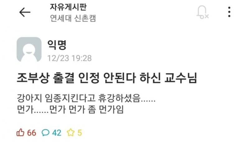 지난해 12월23일 대학생 온라인 커뮤니티 '에브리타임' 자유게시판에는 '조부상 출결 인정 안 된다 하신 교수님'이라는 제목의 글이 올라왔다.