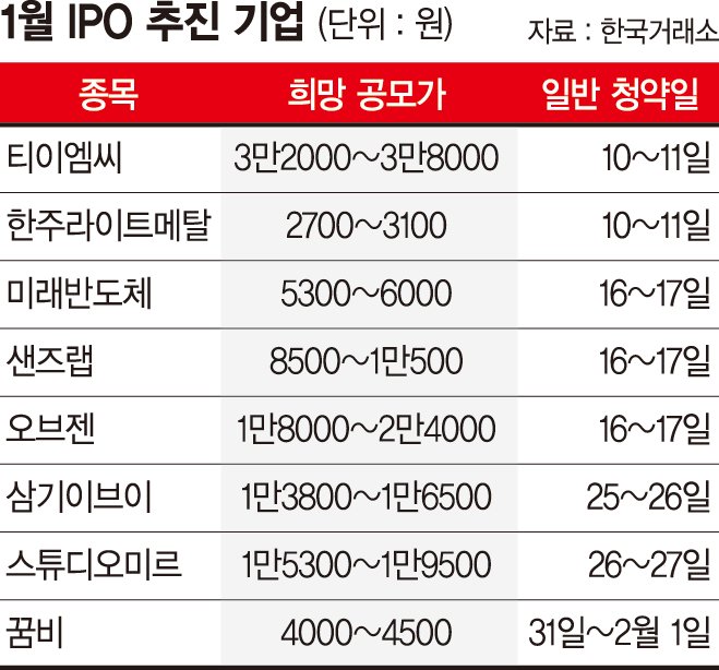 4일 한국거래소에 따르면 티이엠씨와 한주라이트메탈은 이날부터 5일까지 기관투자자 대상 수요예측에 나선다. 이후 10~11일 공모주 청약을 진행한다. 두 곳 모두 오는 19일 상장 예정이다.