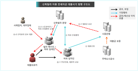 검찰조사 결과, 이번 사건은 임대인과 대출브로커, 임차인 총 3인이 사전에 공모를 하면서 시작됐다. 전셋집에 거주할 의사가 없는 임차인(국외도피 중)이 국토교통부가 운영하는 '무주택 근로자금 대출제도'를 이용해 은행으로부터 대출금을 받았고, 이후 은행으로부터 받은 대출금으로 신축빌라를 구매한 뒤, 구매한 신축빌라를 담보로 대부업체 등에서 또 대출을 받았다.