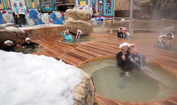 절기상 소한을 하루 앞둔 5일 경기도 용인 에버랜드 캐리비안 베이 야외 스파에서 모델들이 겨울 온천욕을 즐기고 있다.