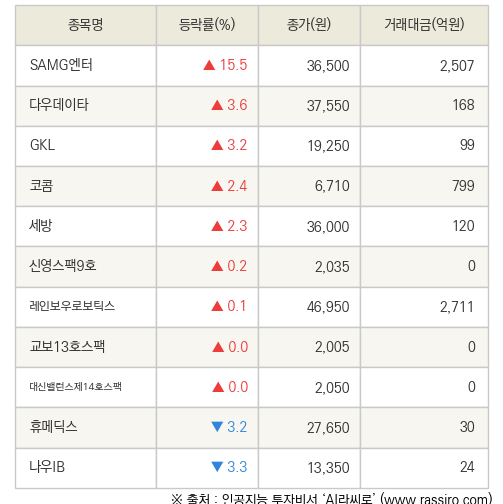 특히 SAMG엔터는 전 거래일 대비 15.5% 오른 36,500원에 거래를 마감하여 높은 관심을 받았다. 이외에 나우IB는 13,950원까지 올라 신고가를 경신했으나, 전일보다 오히려 하락한 13,350원에 거래를 마감했다.