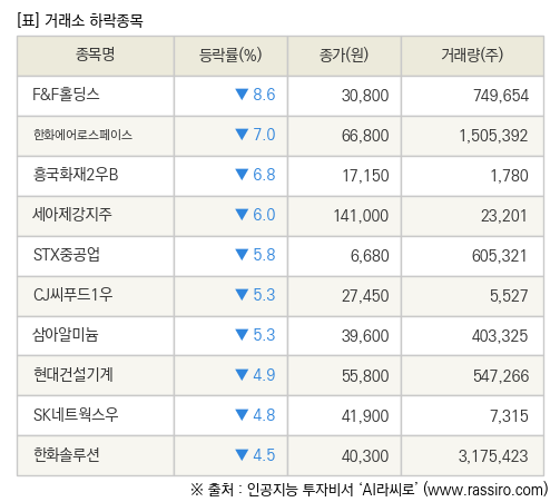 [fnRASSI]장마감, 거래소 하락 종목(F&F홀딩스 -8.6% ↓)